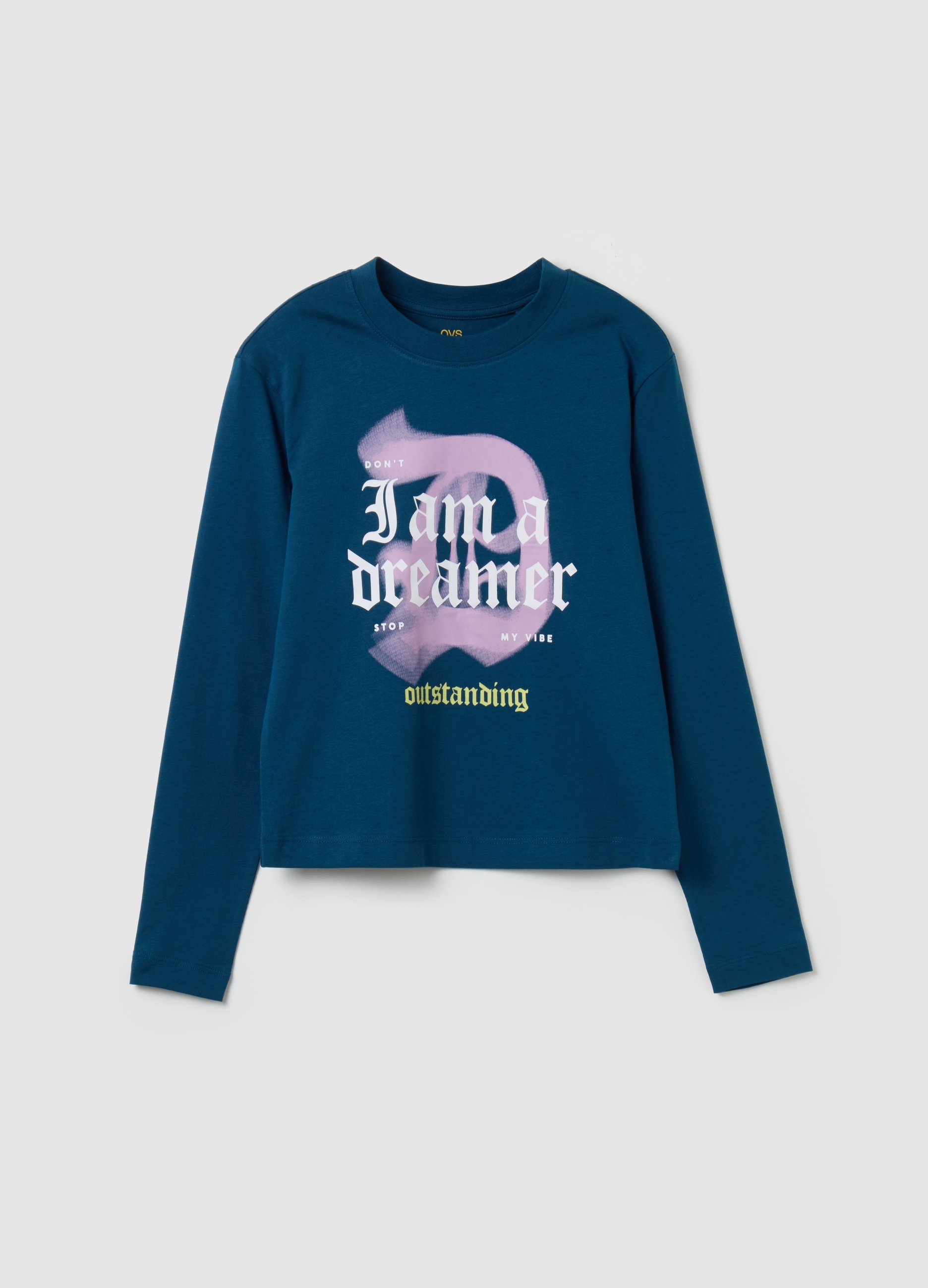 Women's casual t-shirt, suitable for all seasons, blue. The T-shirt features long sleeves and a trendy print. Made with high quality materials to ensure comfort and style on every occasion. Perfect to match with jeans or casual pants.