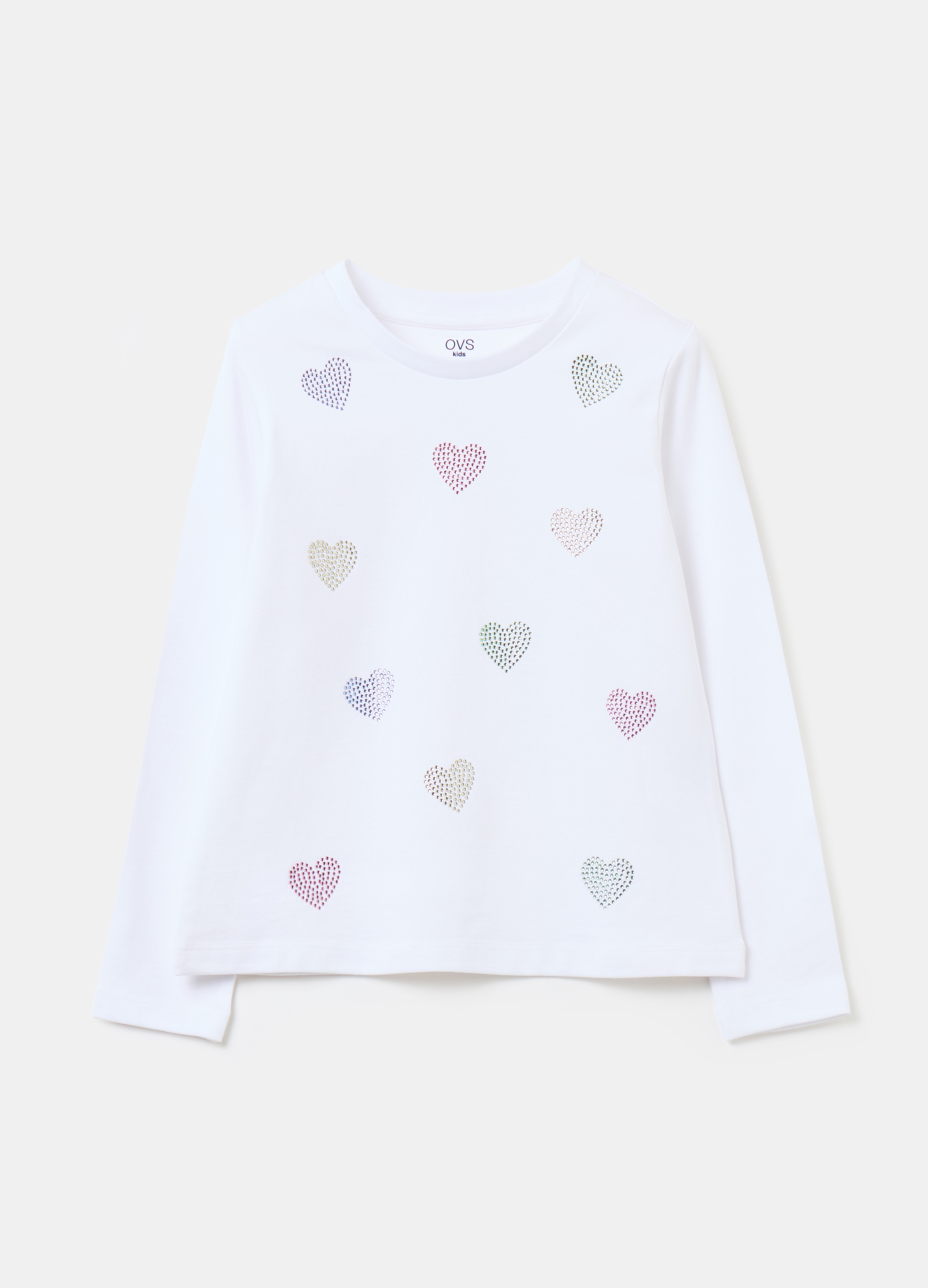 Women's long-sleeved t-shirt with rhinestone hearts, perfect for every season. The white color makes it versatile and easy to match any outfit. Made with high quality materials, it will be an essential garment in your wardrobe. Choose the comfort and style with this casual and trendy T-shirt.