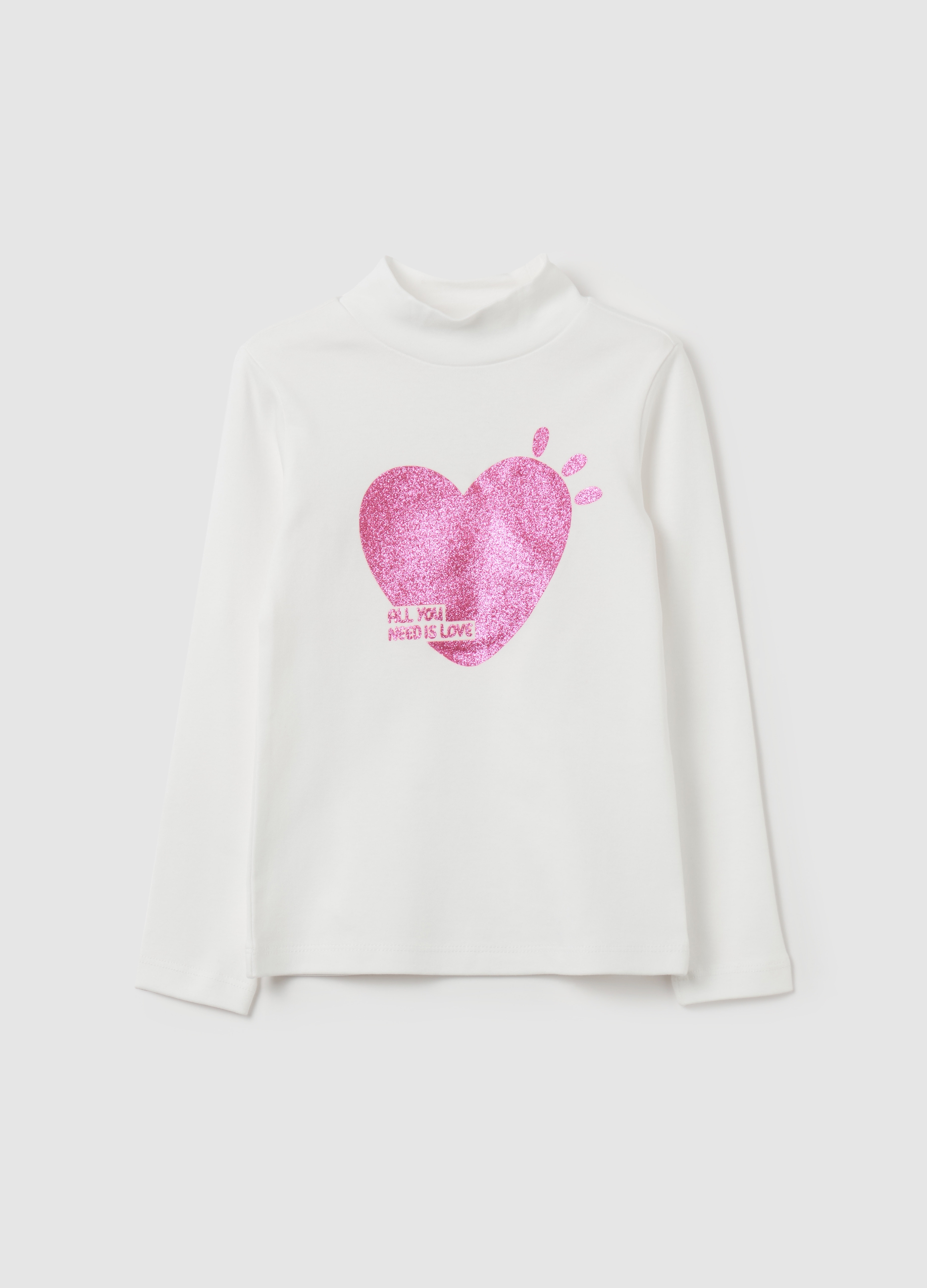 Long sleeve casual t-shirt with print, perfect for every season. The model has a high ribbed neck. Made of soft white fabric, it will be the ideal choice for a trendy and comfortable look. Easy to match with jeans or casual pants for a casual chic outfit.
