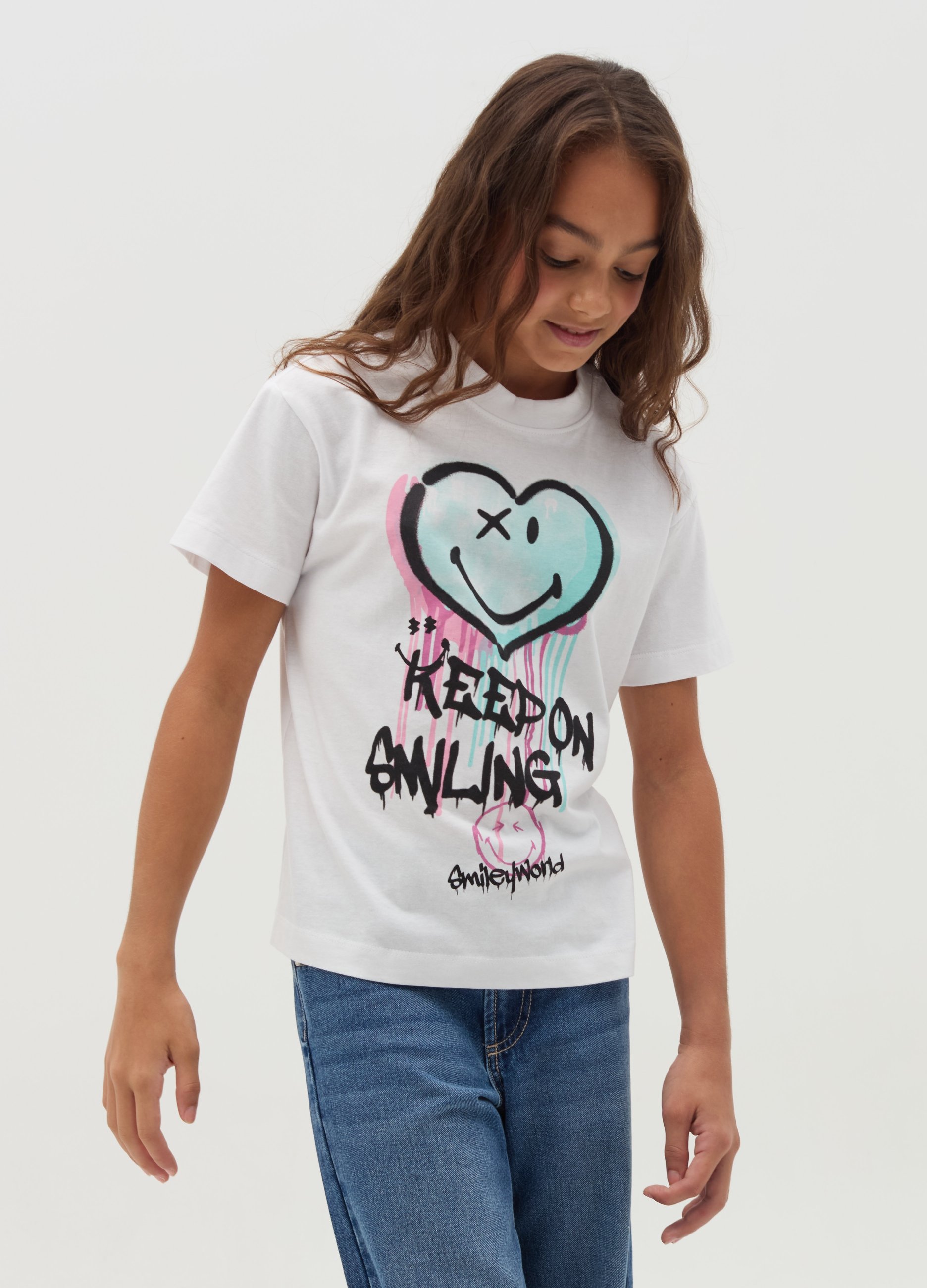Women's casual t-shirt with "Keep On Smiling" print, size 13/14. Perfect for all seasons, ideal for a cool and fashionable look. Made of high quality soft fabric, comfortable and versatile for every occasion. Add a touch of joy to your outfit with this OVS T-shirt.