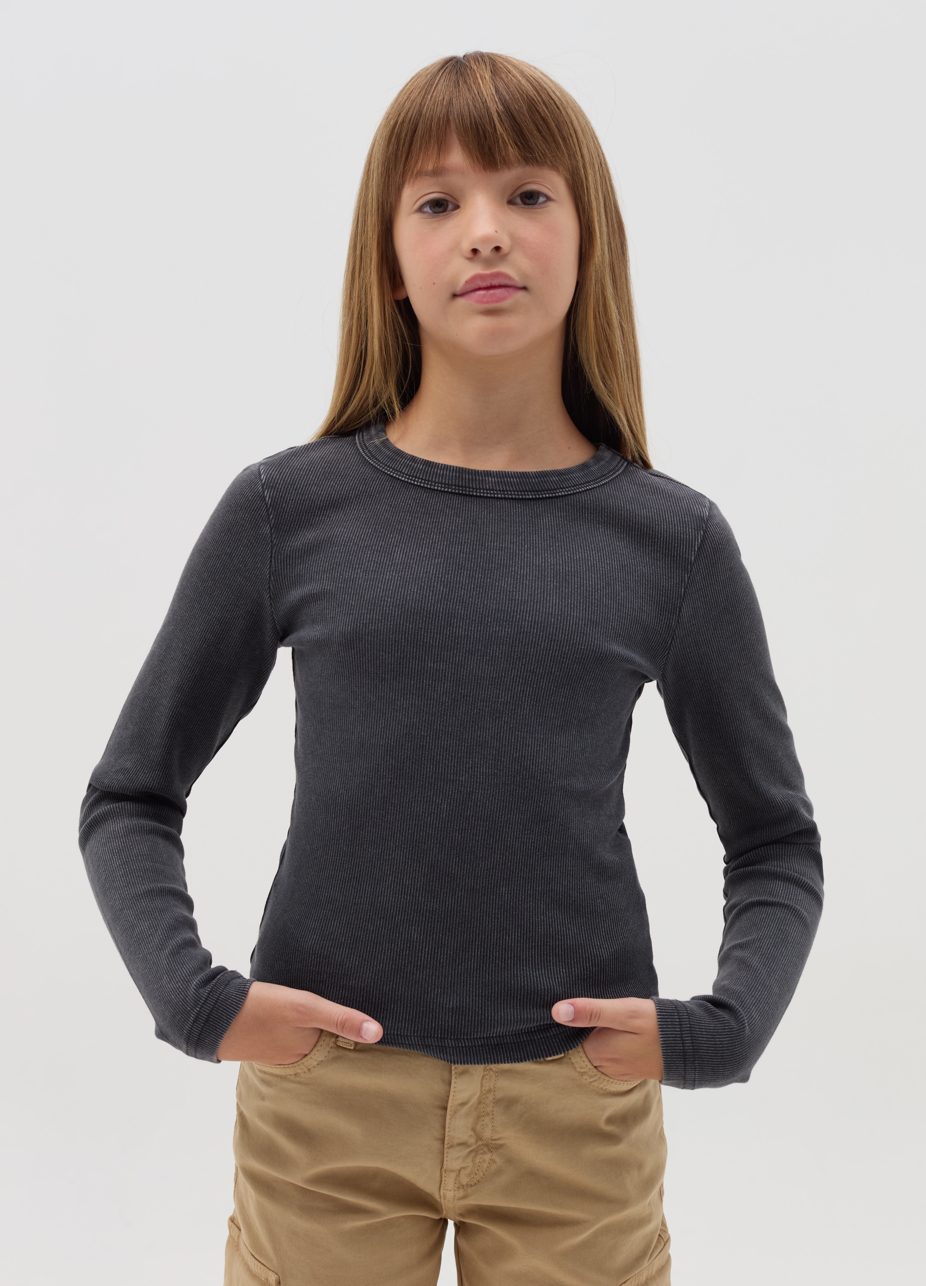 Grey ribbed t-shirt with long sleeves, perfect for autumn and winter. Made with high quality fabric, comfortable and versatile to match any casual outfit. An essential garment in the wardrobe of every woman, easy to wear and always fashionable. Available in different sizes and colors to suit every style requirement.