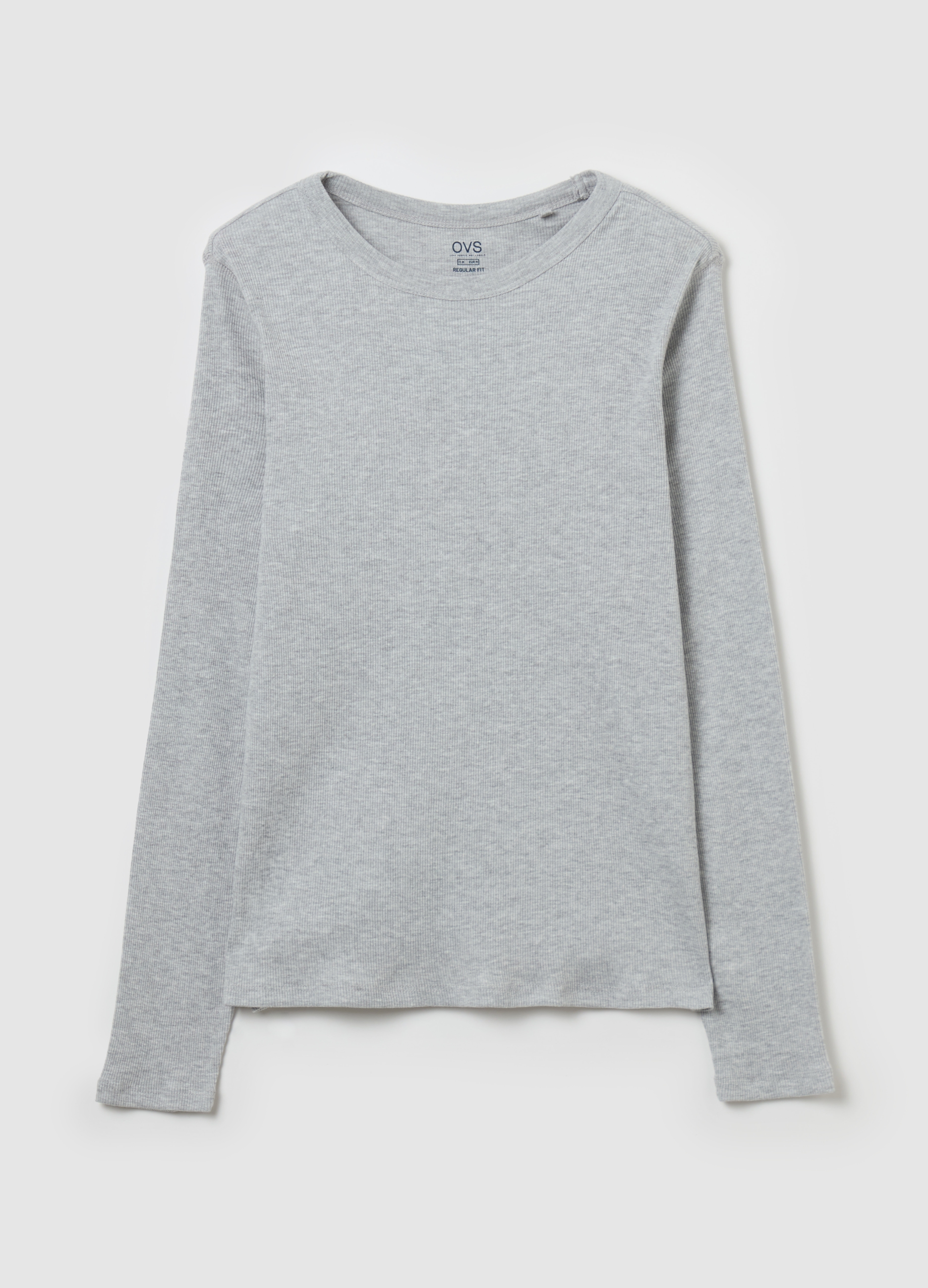 Ribbed T-shirt with long sleeves in soft and comfortable fabric. Grey color suitable for all seasons, ideal for creating casual and fashionable look. The simple and versatile design makes it perfect to match jeans or elegant pants. An essential basic garment for every woman's wardrobe.
