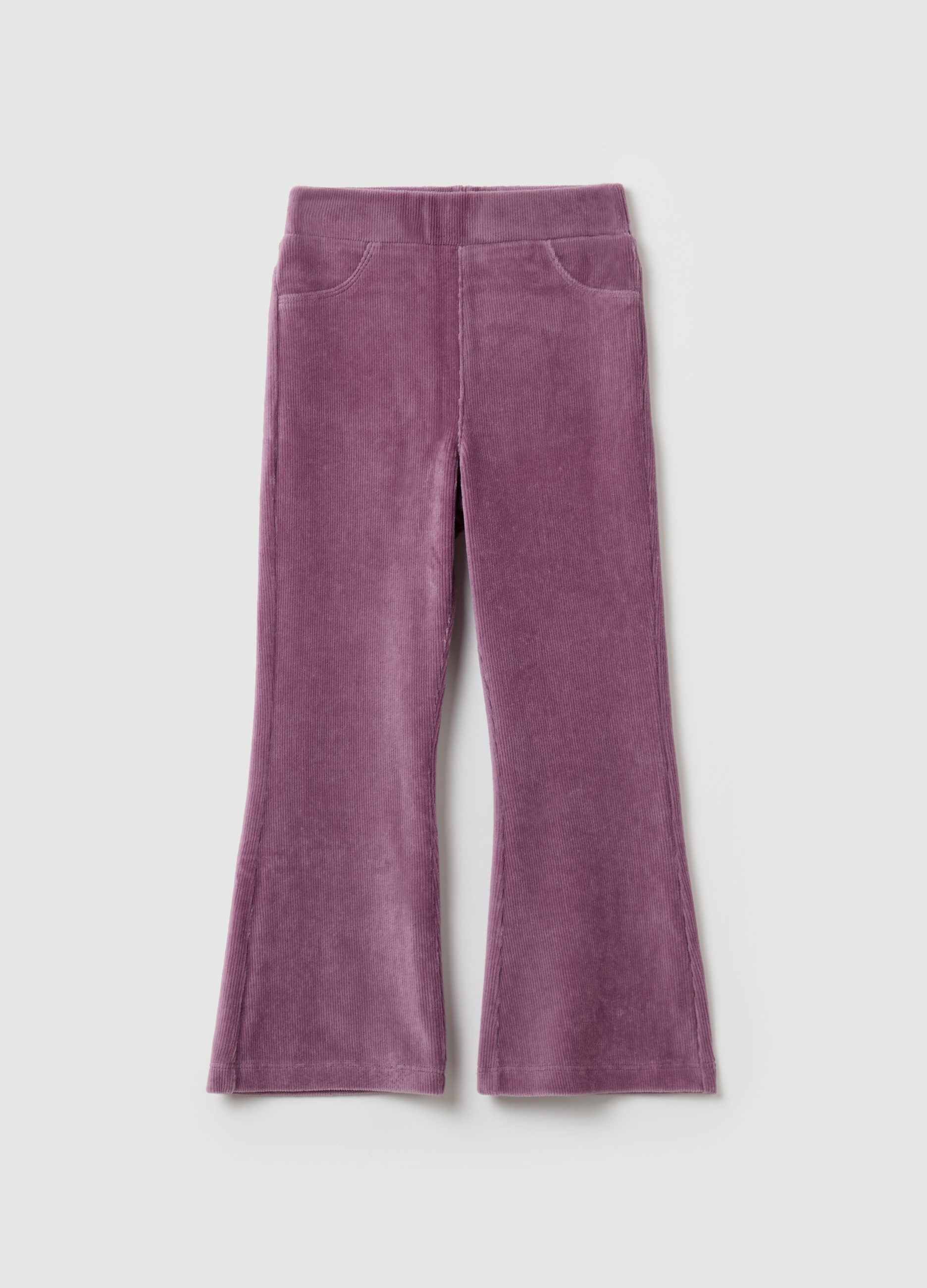 Women's purple ribbed velvet flares treggings, ideal for a casual or sporty look. Suitable for all seasons, they are comfortable and versatile. Made of high quality materials, they guarantee a perfect fit and a trendy look. Perfect to complete your daily outfit with style.