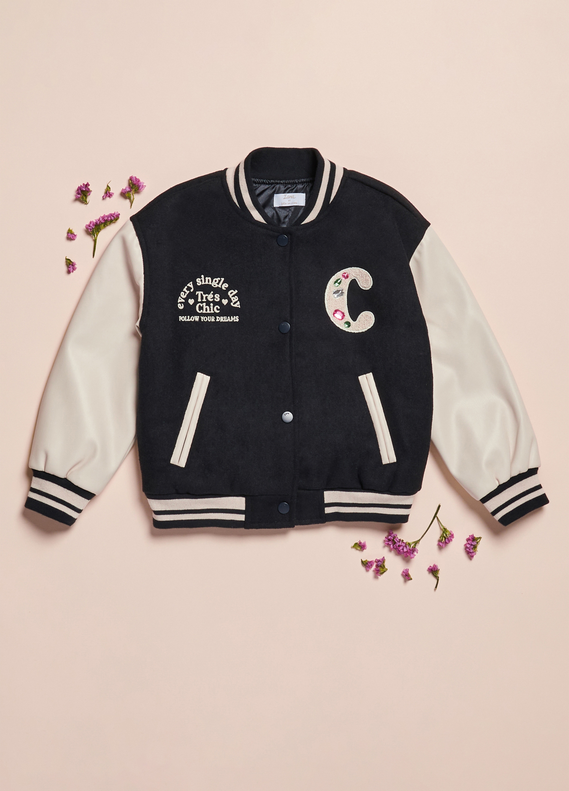 Varsity jacket Iana Bambina is perfect for the Autumn/Winter season. Made of black color, it is a casual garment suitable for various occasions. With sporty and comfortable style, it will be your ally on fresh days. Choose the quality and convenience of OVS.