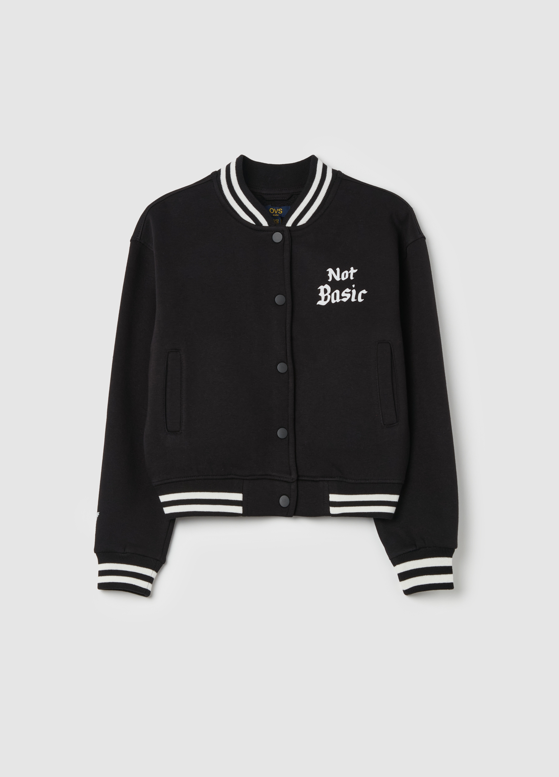 Varsity jacket with lined profiles for women, ideal for a casual and elegant winter look. Made of black fabric, this jacket is perfect for facing colder days with style. A versatile and fashionable garment to match trousers or skirts to create impeccable outfits.