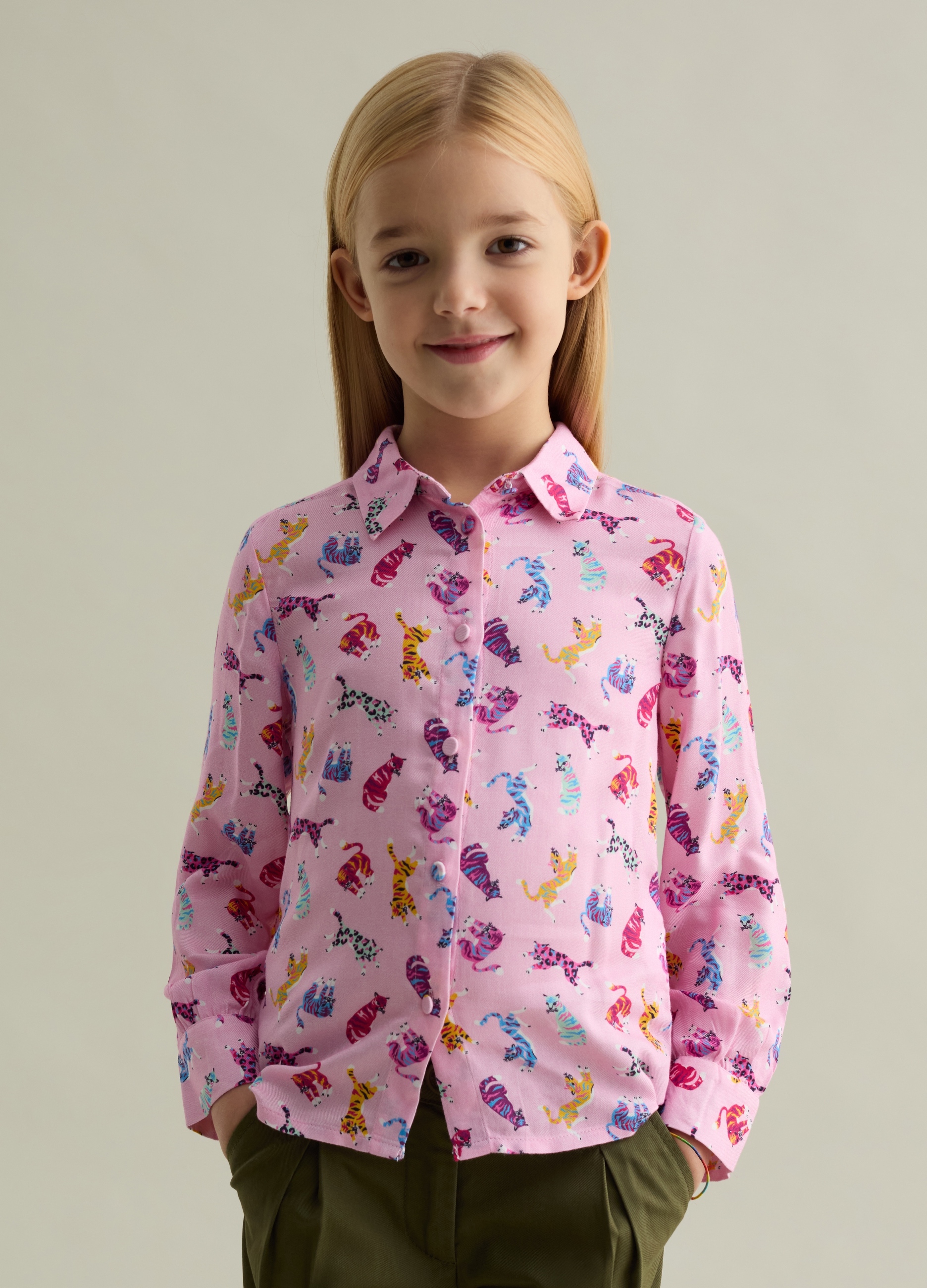 The pinkish ver shirt with tigers print is perfect for spring and autumn. Made of soft viscose, it fits perfectly to a casual but fashionable look. The vibrant color adds a touch of joy to your outfit, while the print adds a touch of personality. Ideal to match with jeans or elegant pants for a versatile and feminine look.