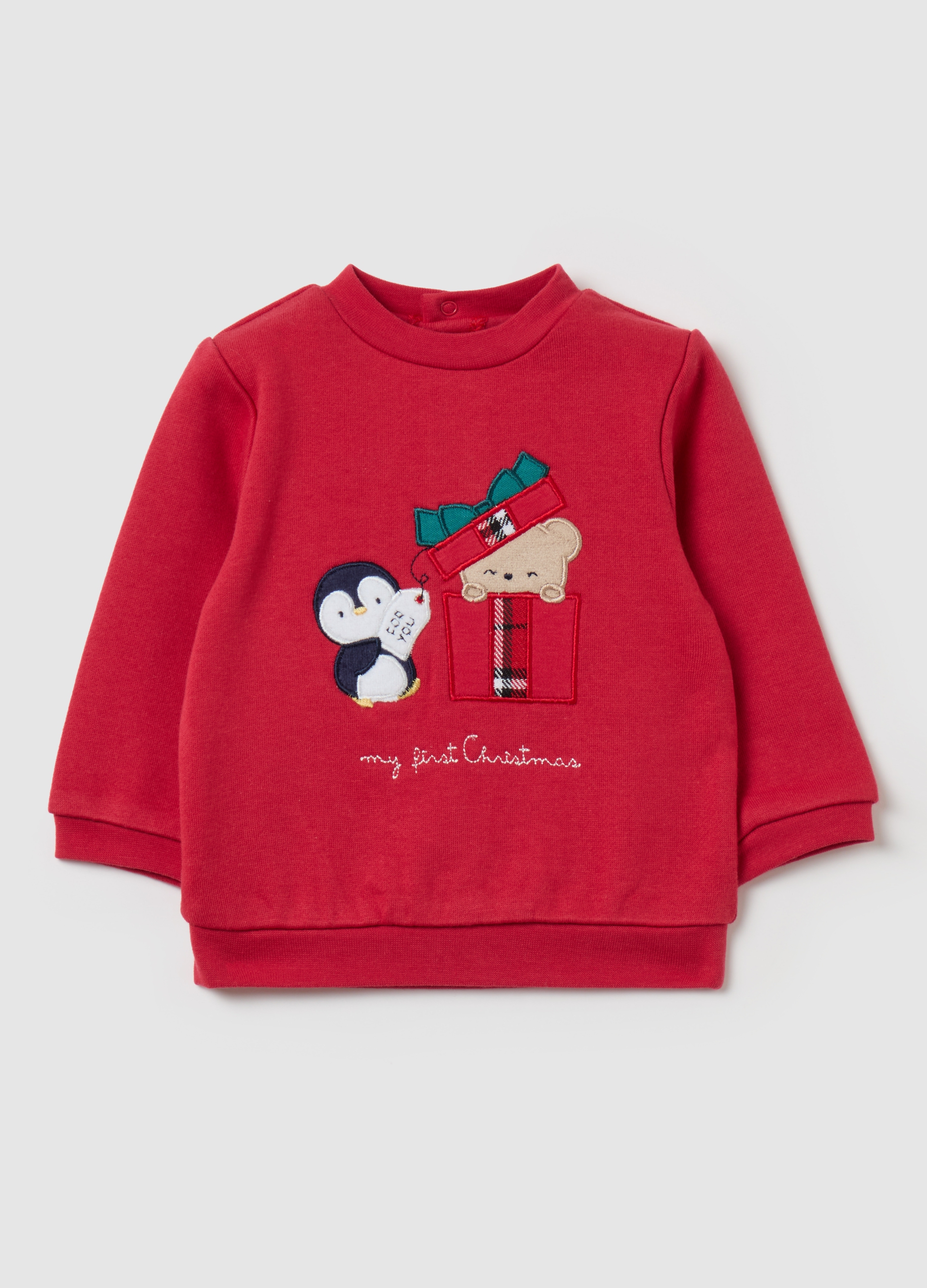 Red bio cotton sweatshirt perfect for autumn and winter. Random design suitable for both men and women. Ideal to celebrate the first Christmas of your child. Sizes available for children from 6 to 9 months.