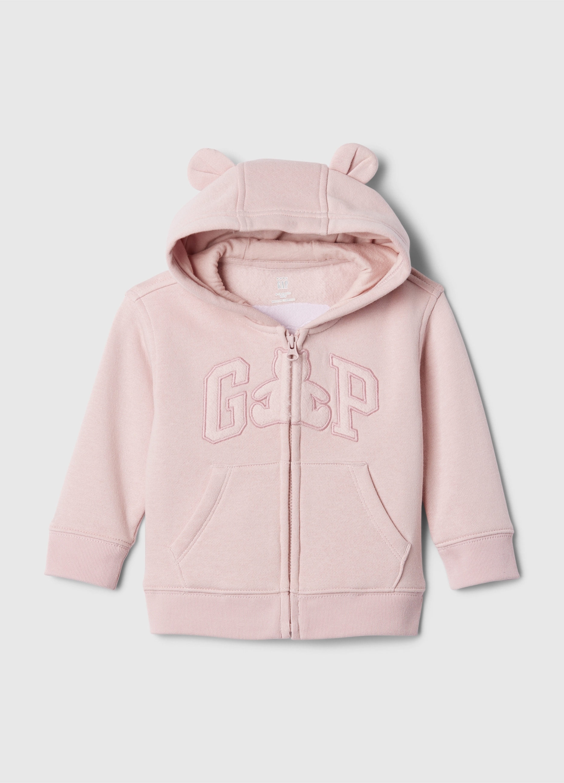 Sweatshirt with zip and hood in pastel pink, decorated with logo embroidery and bear. Ideal for a casual and comfortable look during autumn and winter. Fit both men and women, perfect to complete your daily outfit. Buy now and add a touch of sweetness to your clothing!