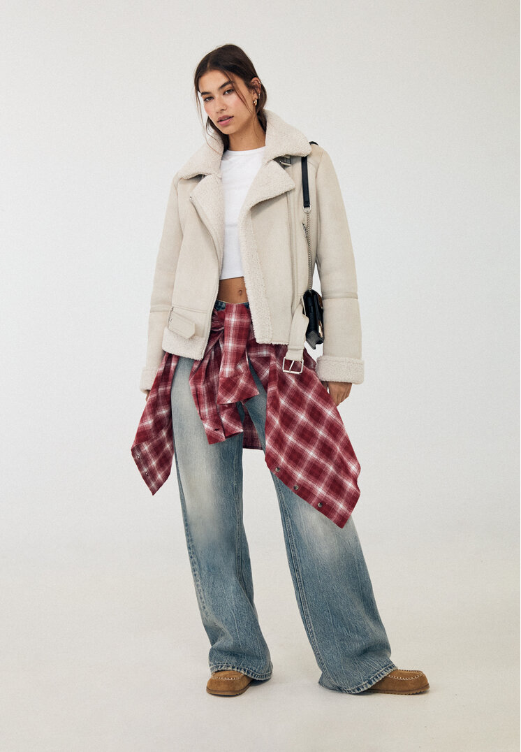 The ecru suede biker double face jacket is perfect for autumn and winter. With revers collar and long sleeves, it closes with a metal zipper and has a belt with loop. The side pockets with metal zipper and the interior make this casual/ stylish garment suitable for multiple occasions.