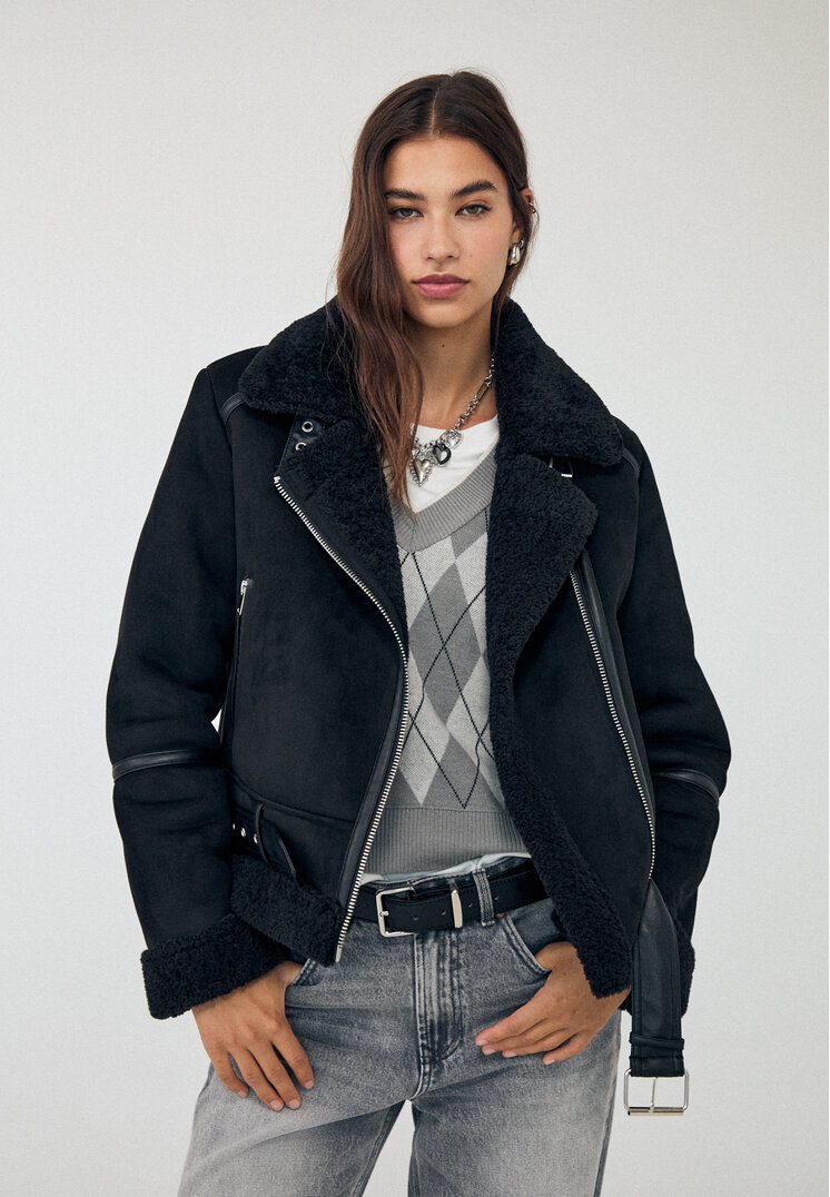 Stradivarius black suede biker double face jacket is perfect for Autumn/Winter season. With revers collar and long sleeves, metal zip closure and belt with loop, it is a casual/ elegant garment ideal for completing every outfit. The side pockets with metal zipper and the interior in soft fabric make it comfortable and practical to wear.
