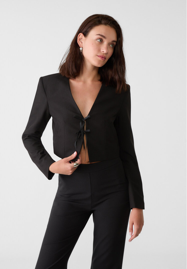 rhinestone blazer cropped with black s_blazer short with v neckline and long sleeves with shoulder straps. frontal detail of satin bows. front clasp with metal hooks.
