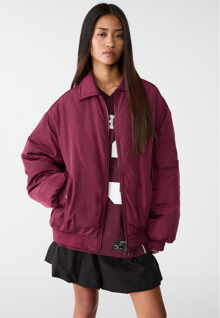 Basic red bomber for women, suitable for autumn/winter season. Bomber style jacket with revers collar, long sleeves and front pockets. Ribbed finishes with soft and comfortable fabric. Available in size XS.