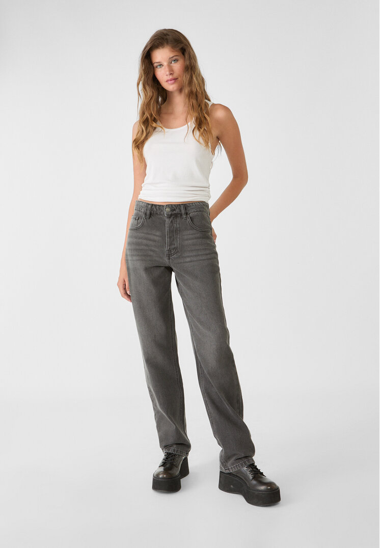 Mid-life black jeans, with five pockets and straight leg. Front closure with zipper and metal button. Perfect for a casual and elegant look during the spring/summer season.