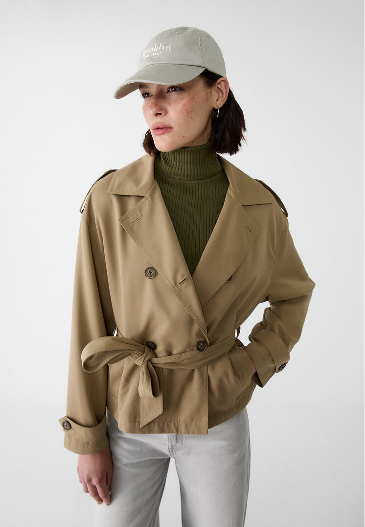 Short trench with khaki belt for women, perfect for autumn and winter. This garment is double-breasted with buttons, revers neck and side pockets. The details on the sleeves add a touch of elegance and style to this casual/ stylish garment.
