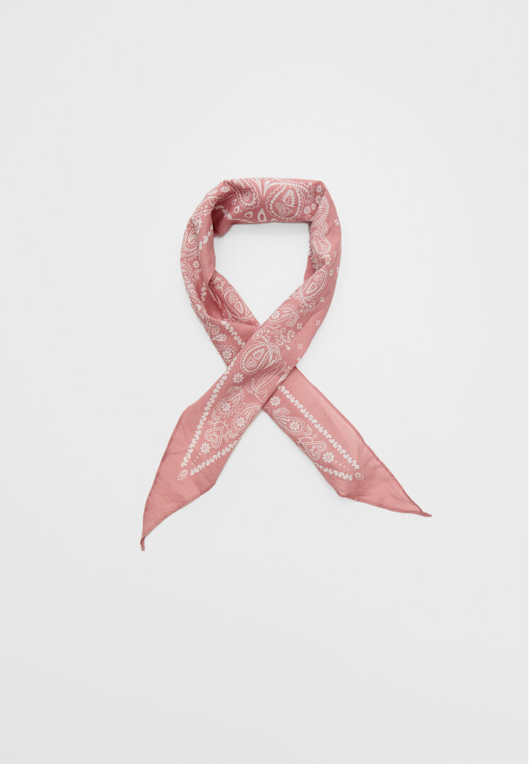 Bandana printed in powder pink, perfect for spring/summer season. Made of light and soft fabric, ideal to complete your casual and elegant outfits. Available in various colors, it will give a touch of freshness and femininity to your look. To wear with a simple jeans and a blouse for a trendy and sophisticated look.