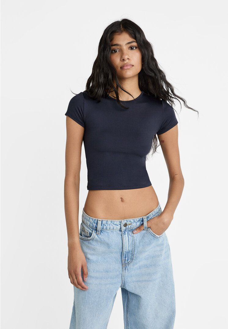 stradivarius basic t-shirt in polyamide blue sea m_maglietta short-cut in mixed polyamide. round neck and short sleeves. available in different colours.