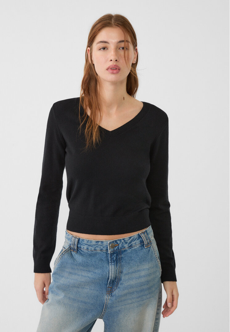 stradivarius basic v-neck black xs_long sleeve shirt with v-neck ends at ribbed ends. available in different colours.