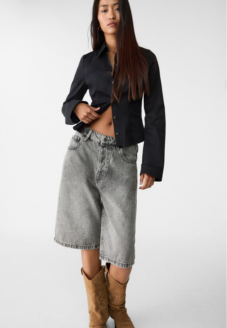 Black denim bermuda from the Spring/Summer collection of Stradivarius. Taglio baggy with medium and passing life. Front and rear pockets applied. Zipper closure and metal button. Comfortable and versatile for a casual/ stylish look.