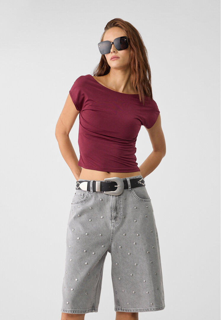 stradivarius bermuda jort jeans studs denim black 46_bermuda to medium life with passers. front pockets and pockets applied on the back. metal studs on the front. straight leg. front closure with zipper and metal button.