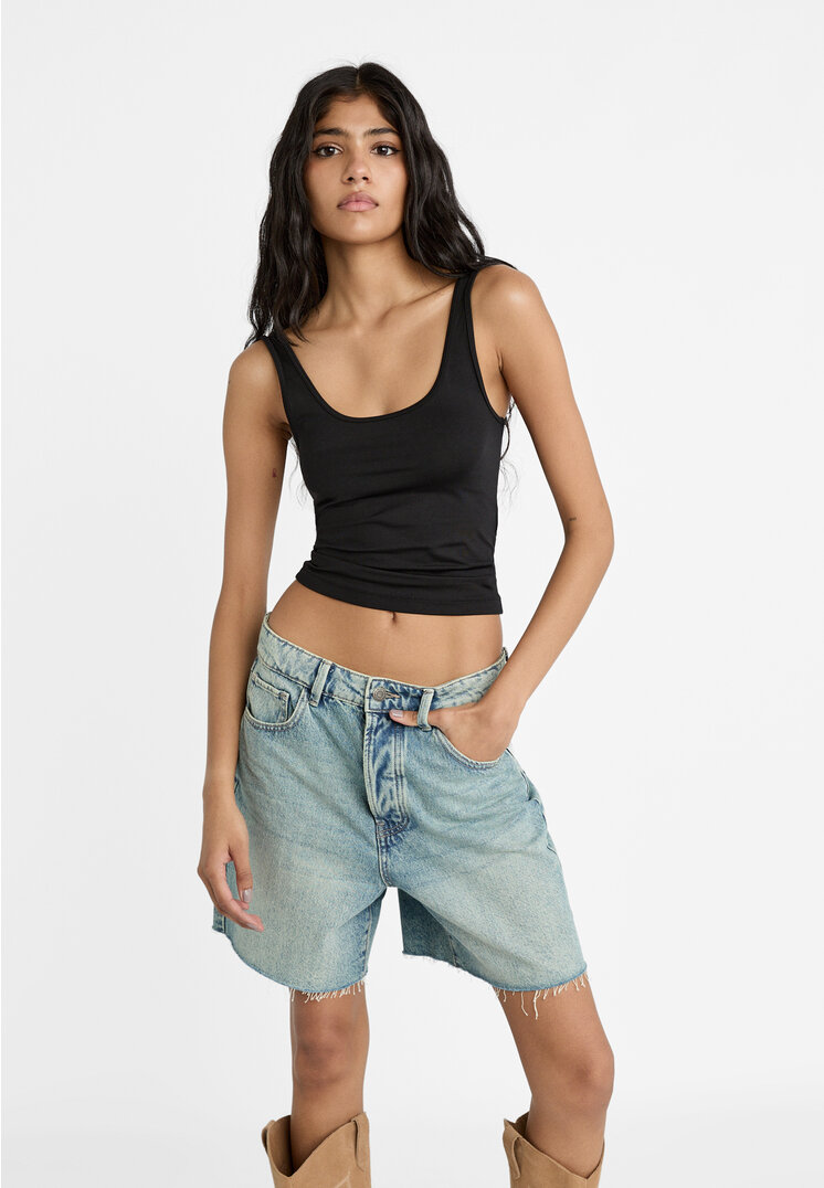 stradivarius bermuda low waist denim blue 40_bermuda in denim at low waist with five pockets and loose edge. straight leg. closure with metal button. available in different colours.