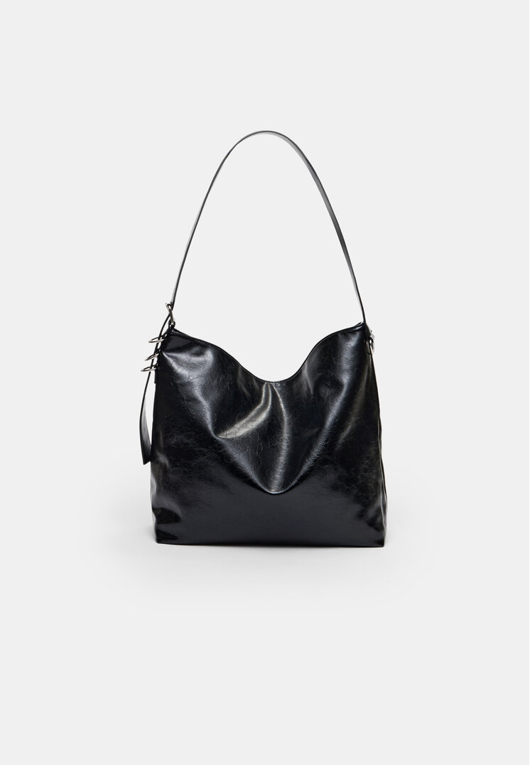 Bucket bag in black leather, ideal for a casual but elegant look. The adjustable handle allows you to carry it comfortably to shoulder or hand. Perfect to wear during spring/summer to complete your outfit with style.