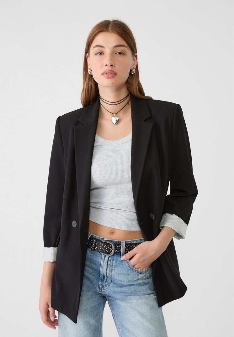 stradivarius blazer slim fit double-breasted black m_blazer with revers neck, long sleeves with twisted and contrasting combined lining. fake front pockets with flap with flap. double-breasted front closure with buttons.