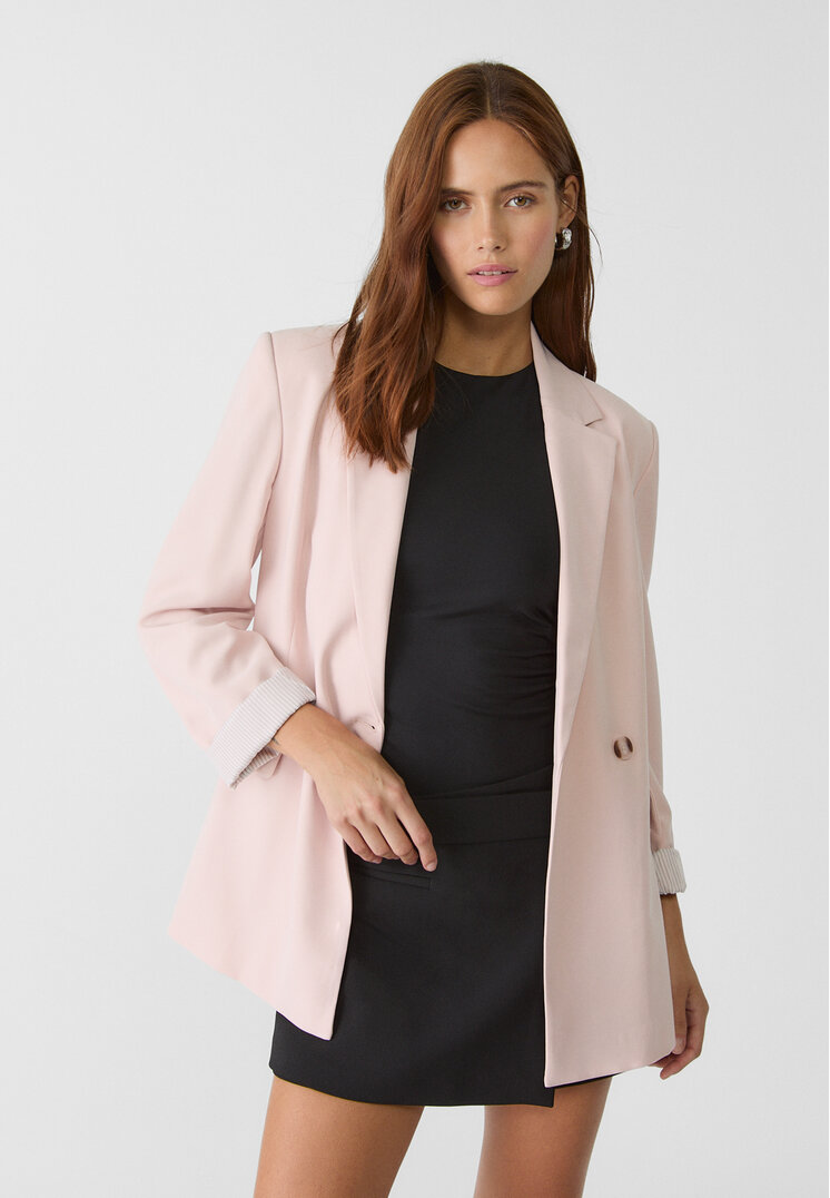 stradivarius blazer slim fit double-breasted light pink xl_blazer attached with revers neck, long sleeves with twisted and contrasting combined lining. fake front pockets with flap with flap. double-breasted front closure with
