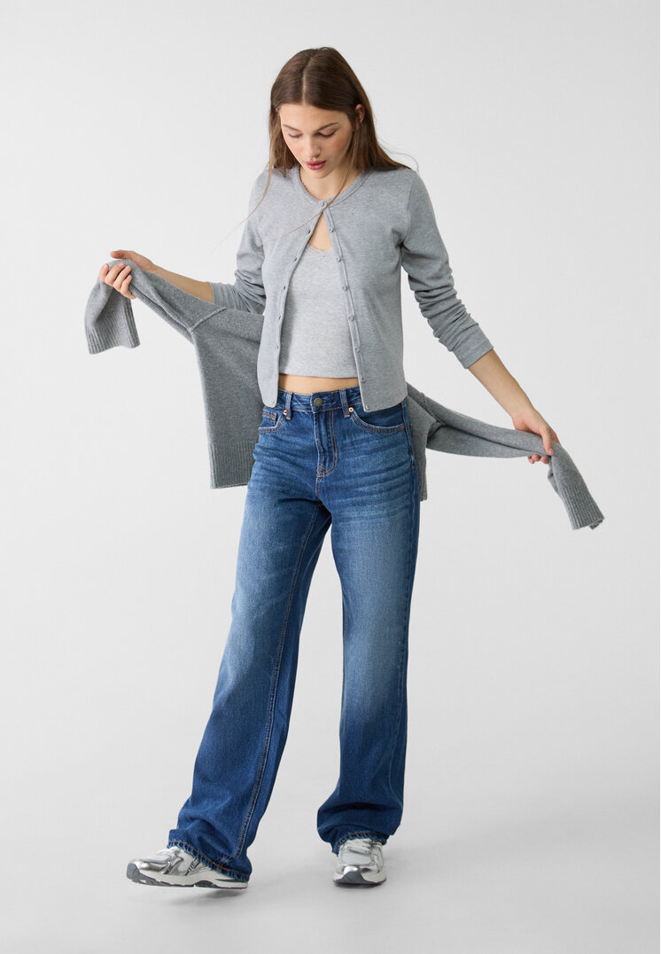 stradivarius d92 straight wide denim blue 44_jeans straight wide fit with five pockets. front closure with zipper and metal button. waist: high waist, all' height of ' navel fabric: vintage effect, 100%