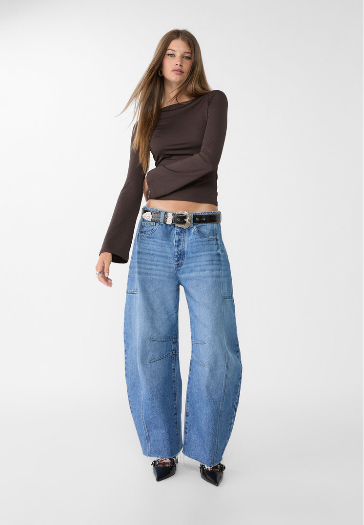 stradivarius jeans balloon fit denim blue 46_medium waist jeans pants with front pockets. pockets applied back. front closure with zipper and metal button.