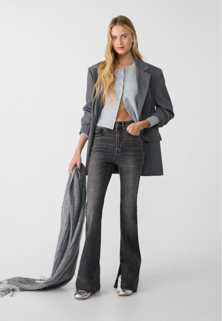 stradivarius jeans flare sledge denim black 36_jeans very high waist flare with edge with internal side slit. model with five pockets. front closure with zipper and metal button. life: super high waist, above l'ombelico