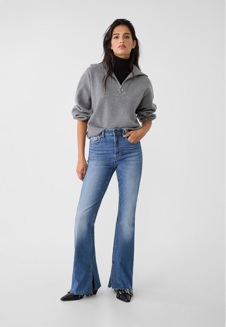 stradivarius jeans flare sledge denim blue 42_jeans very high waist flare with edge with internal side slit. model with five pockets. front closure with zipper and metal button. life: super high waist, above l'ombelico