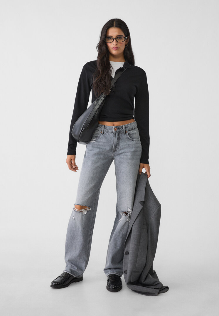 stradivarius jeans straight low denim black 38_jeans low waist with loops. front pockets and back applied pockets. straight leg. front closure with zipper and metal button. available in different colours.