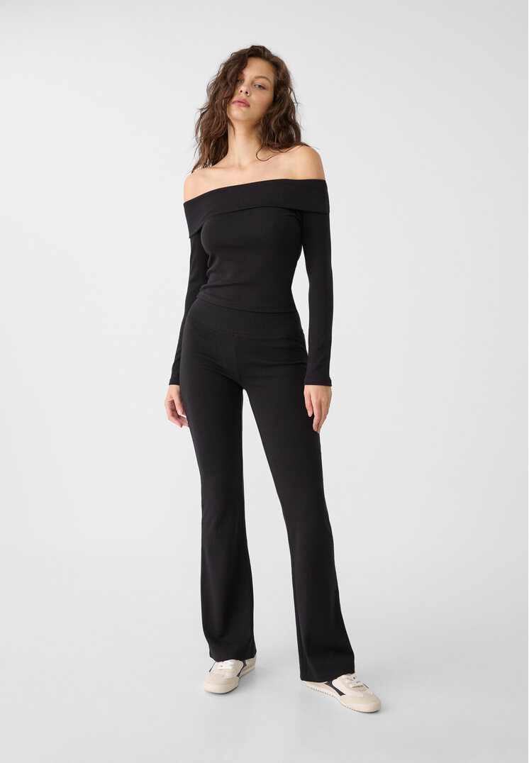 stradivarius life bell trousers rod black m_high waist bell trousers with high elastic ribbed. rigged edge. available in different colours.
