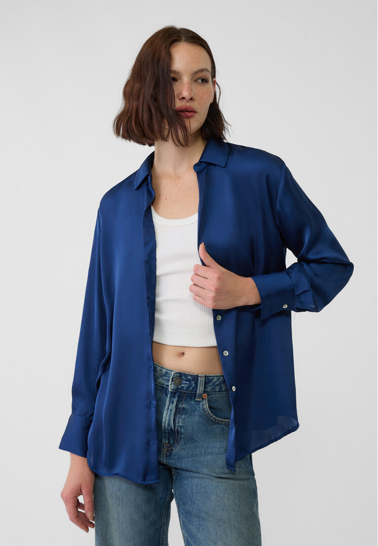 stradivarius satin shirt with revers collar blue sea xs_shirt in satin fabric with revers collar, v neckline and long sleeves with two buttons. front closure with buttons. available in different colours.