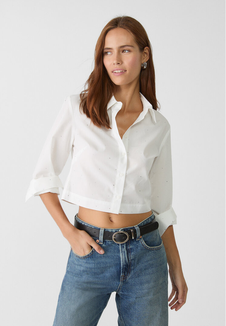 stradivarius shirt in popeline with strass white short s_shirt with collar in revers and long sleeves with cuffs. strass applied on the front. front closure with buttons.