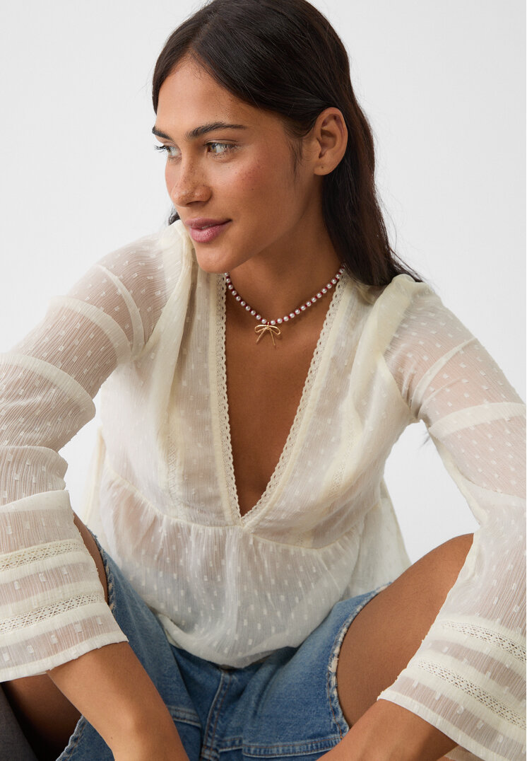 stradivarius shirt soft v ecru neckline soft semi-transparent shirt with v neckline and long sleeves. volant and application in lace. without lining. available in different colours.
