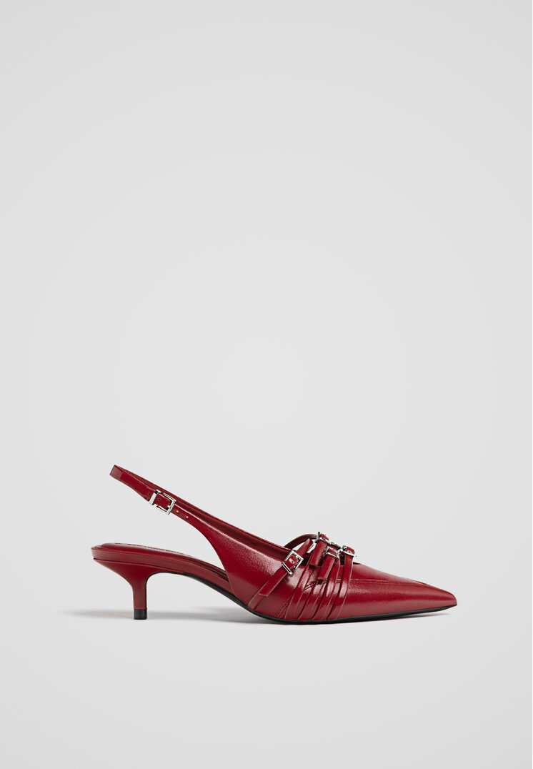 stradivarius shoes with heel, straps and red buckles 37_scarpe with heel and detail of buckles. cross straps on the upper. closure with side buckle. available in red. heel height: 3.5 cm.