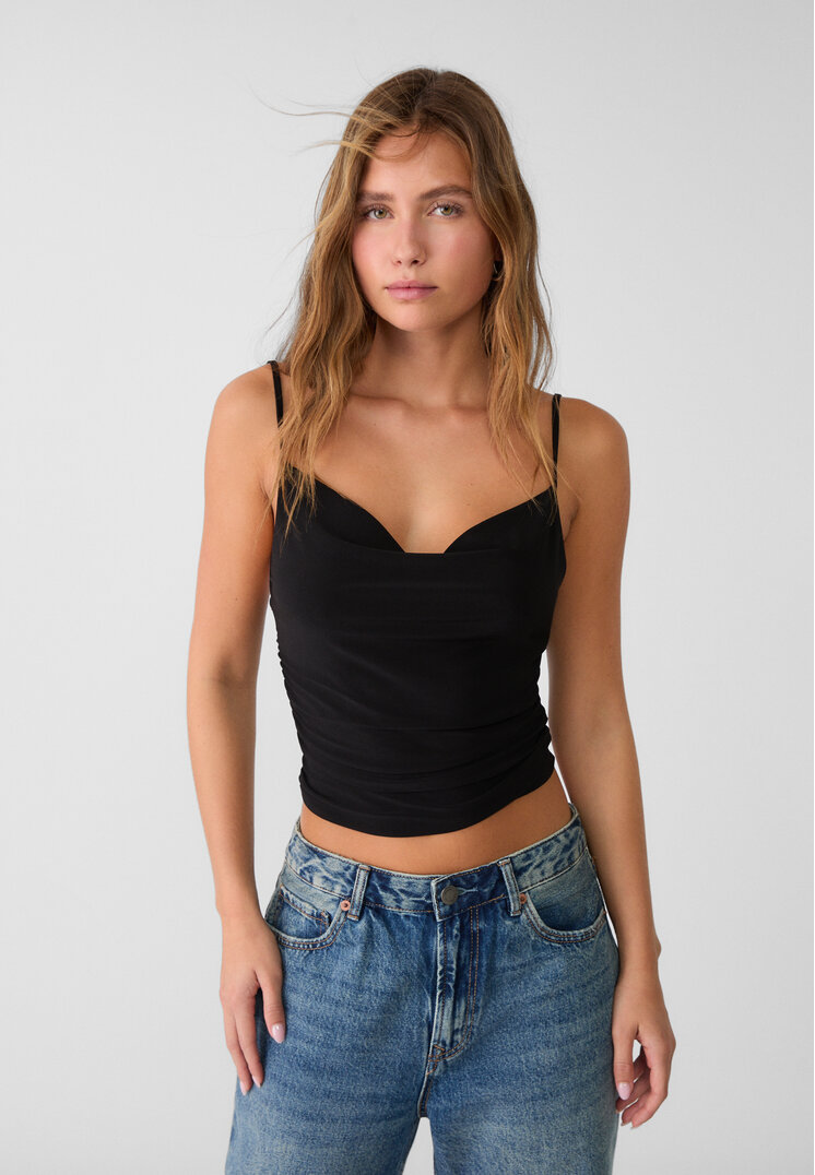 Top short printed black, tight and with soft neckline. The thin shoulder straps are adjustable, perfect for spring and summer. Available in various colours.