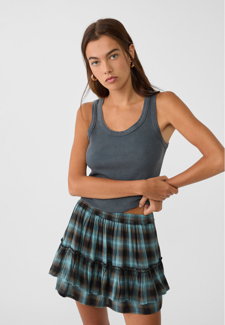 stradivarius short skirt soft squares blue m_short skirt with high elastic waist. detail of volant.