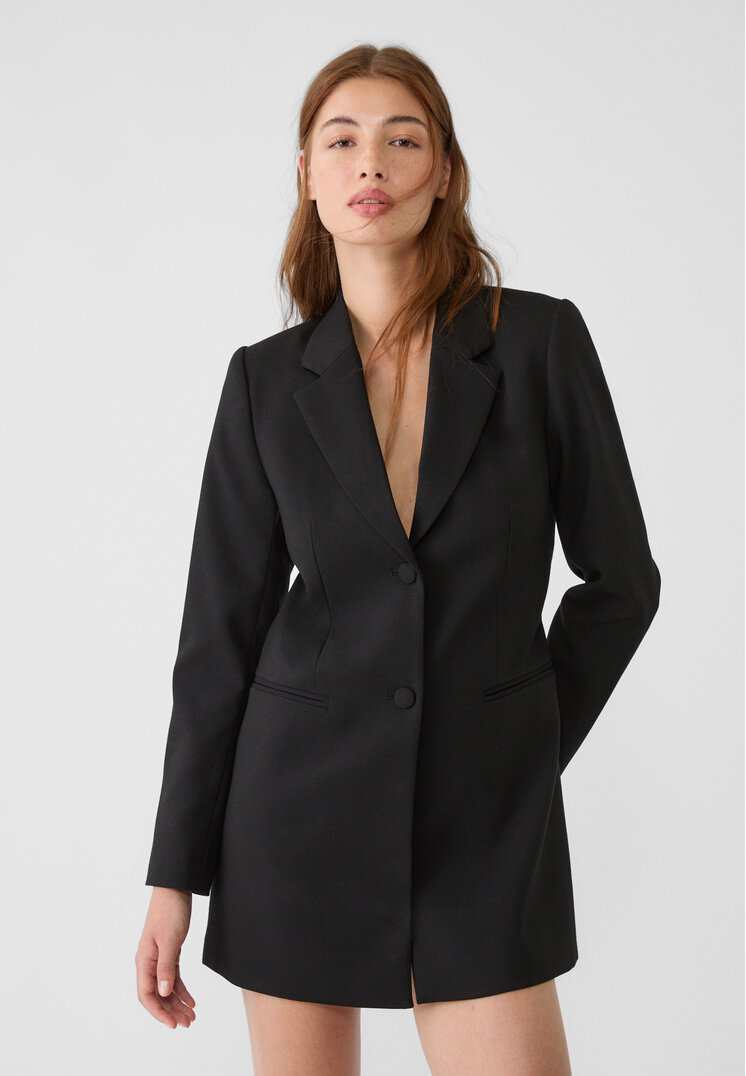 stradivarius short suit blazer style with black back neck xs_allta short style blazer with revers collar and long sleeves. fake pockets front to thread. detail of pants skirt and back discovered. closure