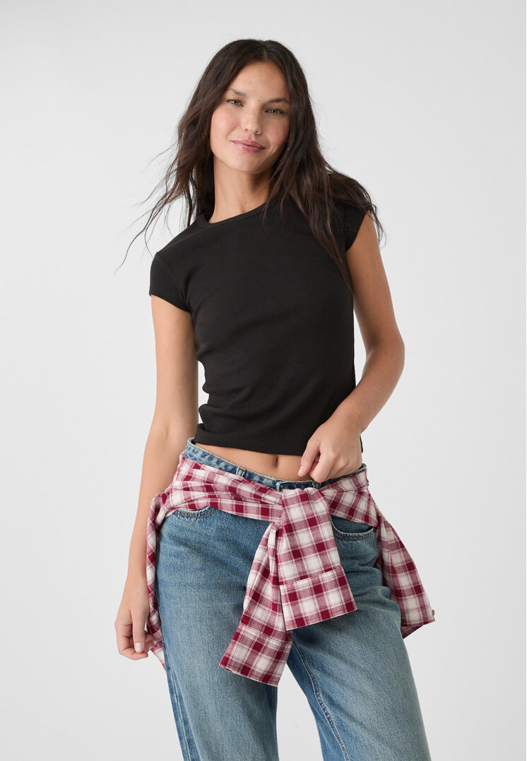 Black T-shirt in canneté Stradivarius XS, adherent with round neck and short sleeves. Available in different colours, ideal for spring/summer.
