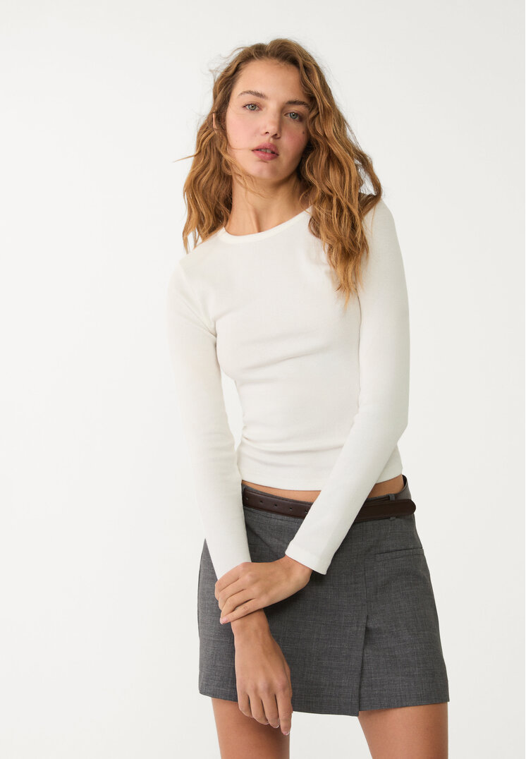 Long sleeve shirt in ribbed fabric, with ecru colour. Fitted fit, with round neck. Perfect for autumn and winter. Available in various colours.