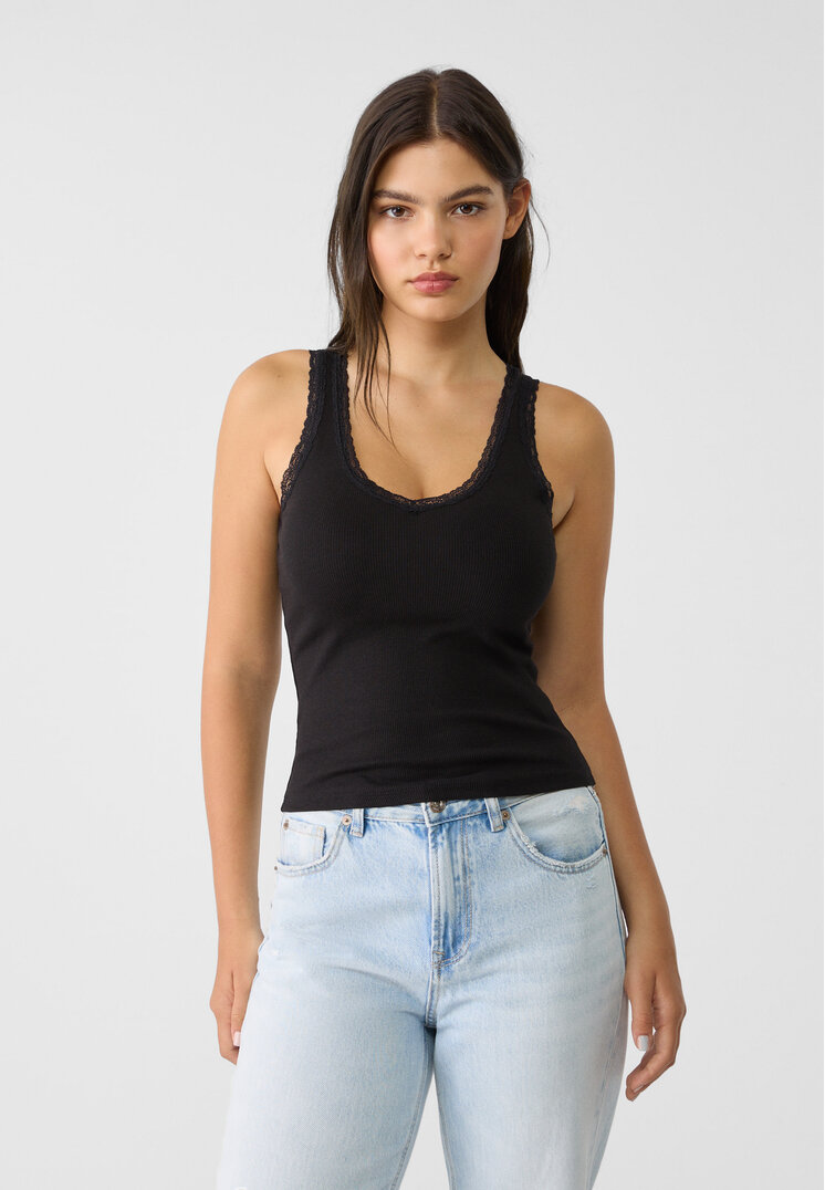 stradivarius t-shirt with v-neck and black lace l_canotta with v-neck finishes with lace application combined tone on tone. available in different colours.