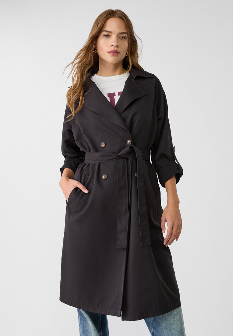 stradivarius trench long soft black s_trench long soft crossed with button closure, revers collar, low shoulder and long sleeves. front pockets with thread.