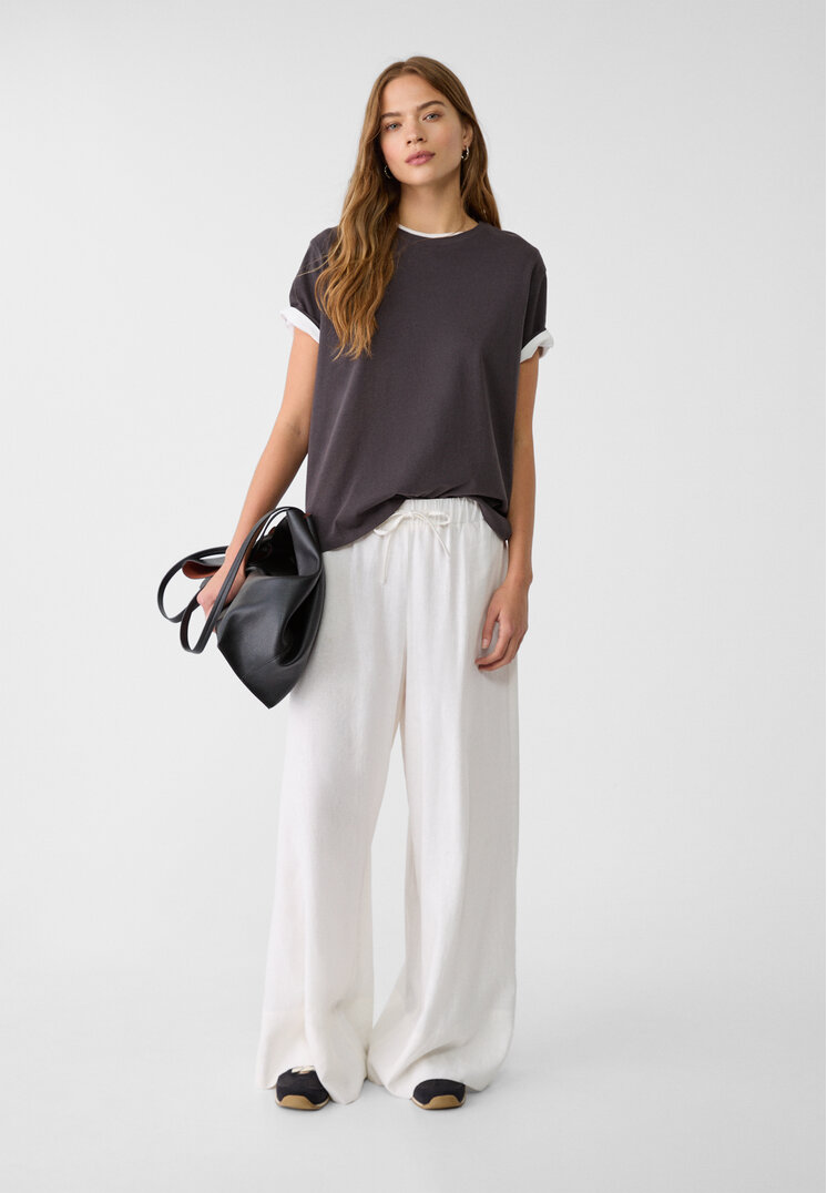 stradivarius wide leg trousers with elastic waist in ecru m_soft waist trousers in linen and viscose blend fabric. elastic waist adjustable with tone on tone. side pockets. wide and straight leg.