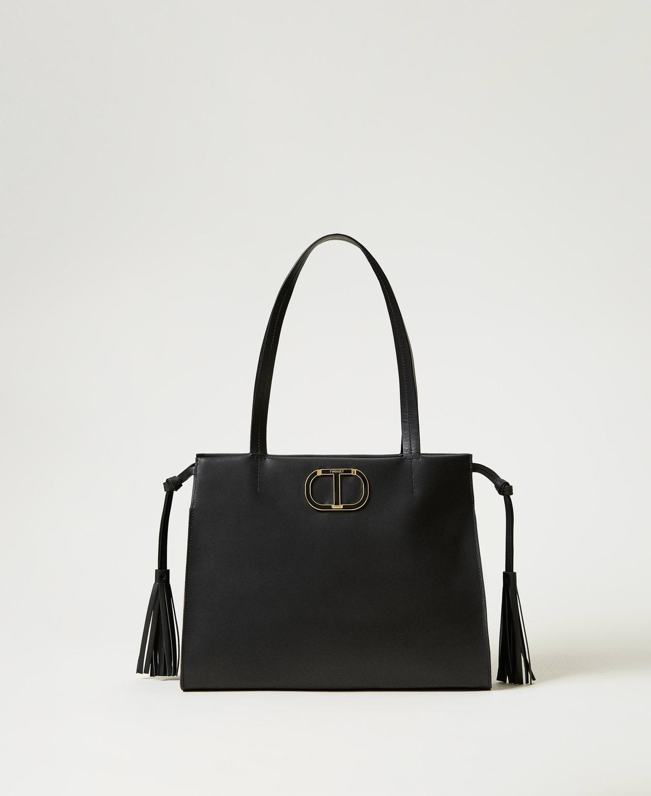Stay stylish and chic this Autumn/Winter season with the Twinset 'Étoile' shopper bag in classic black. This unisex bag effortlessly combines casual and elegant style, making it perfect for any outfit. Whether you're running errands or heading out for a night on the town, this versatile bag is a must-have accessory. Add a touch of sophistication to your look with this timeless Twinset bag.