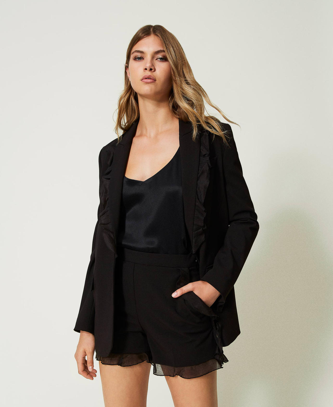 These casual black unisex pants from Twinset are perfect for all seasons. With a stylish design and comfortable fit, they are a versatile addition to any wardrobe. Featuring a flattering flared silhouette, they are ideal for everyday wear or dressier occasions. Stay stylish and comfortable with the Twinset shorts with ruffles.