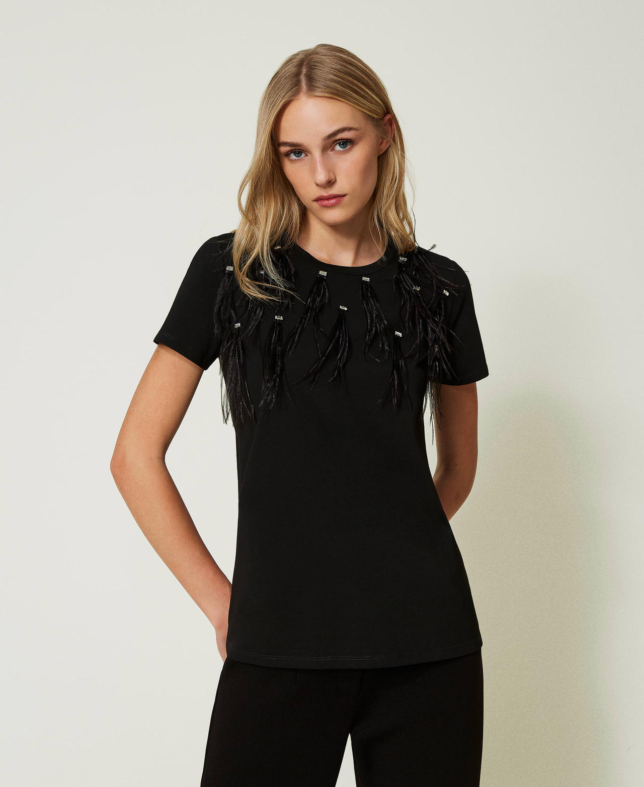 Elevate your casual wardrobe with this Twinset black T-shirt, perfect for the warmer months. The intricate embroidery adds a touch of sophistication to this unisex top. Made for effortless styling, this versatile piece is ideal for Spring and Summer. Add this comfy and stylish T-shirt to your collection for easy everyday wear.