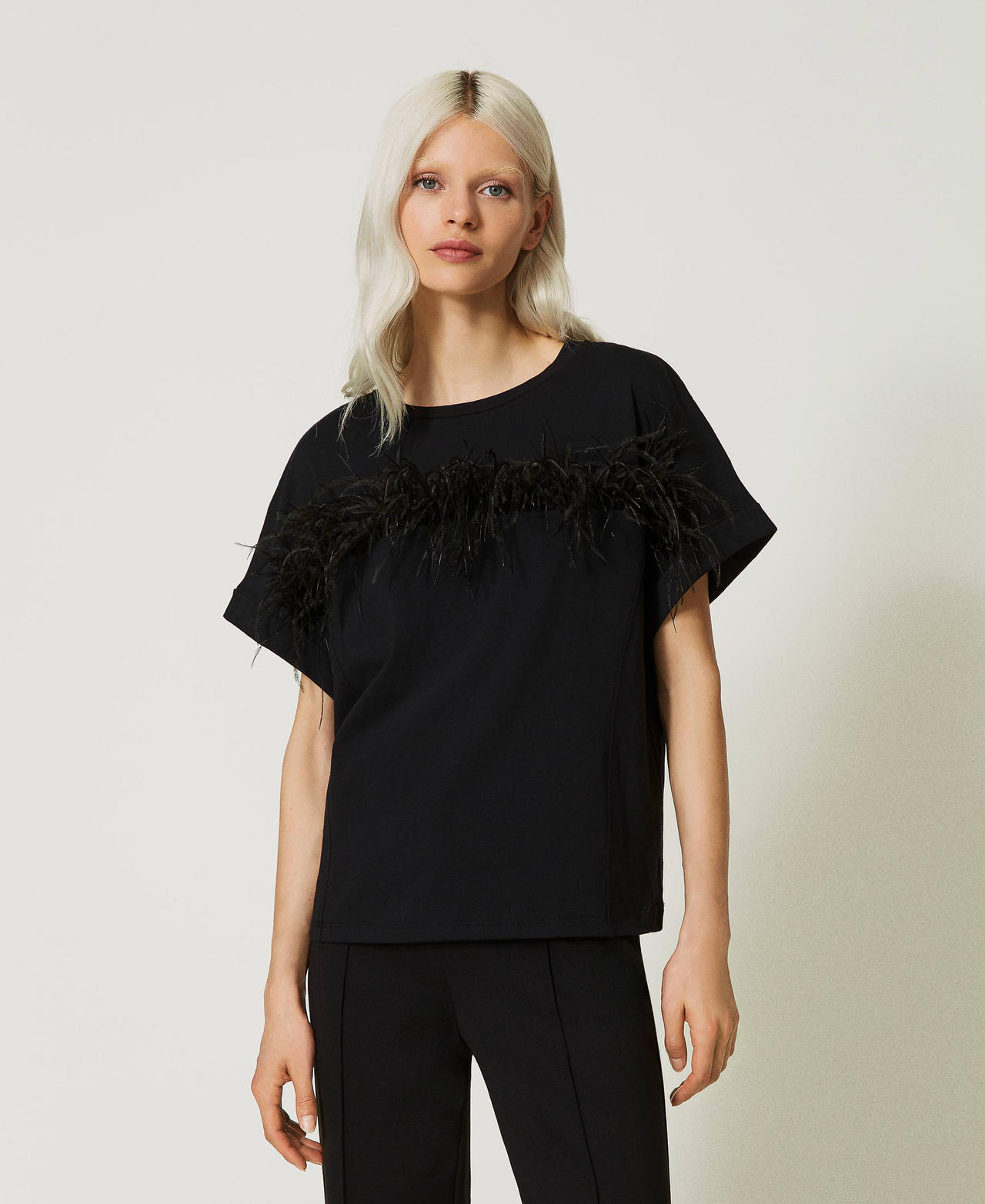 This unisex Casual T-shirt from Twinset is perfect for the Spring/Summer season. In a sleek Black color, it features a stylish feather design. Stay trendy and comfortable all day long in this versatile piece. Perfect for any casual outing or day out.
