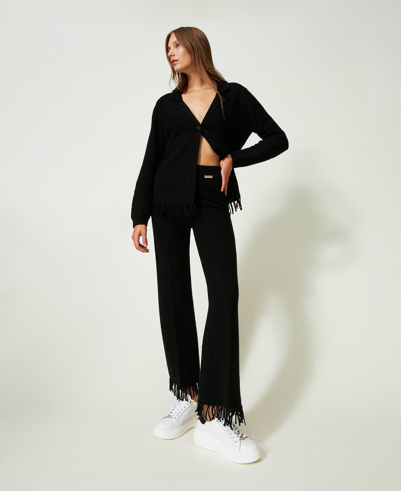 Stay trendy with these black casual pants from Twinset, perfect for both men and women. Made from wool with fringed details, these versatile pants are ideal for all seasons. Add a touch of style to your wardrobe with this unisex piece that can be dressed up or down effortlessly. Stay comfortable and stylish no matter the weather with these Twinset pants.